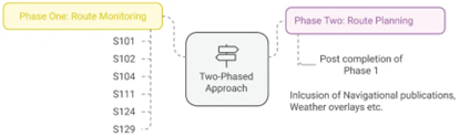S-100产品的开发阶段:S-100产品分两阶段开发,逐步实现从航线监控到全面航线规划的功能覆盖: