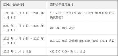 国际海事组织(IMO)于2022年11月认可S-100为电子导航海事服务的数据框架,并通过了基于S-100的ECDIS性能标准。不同时期安装的ECDIS需满足以下合规要求: