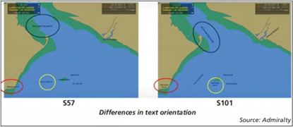 1、增强文本方向:通过动态调整文本方向,解决传统S-57中文字重叠问题,确保关键信息(如水深、地名)在任何显示角度下均清晰可读(Source: Admiralty)。