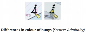 2、改进符号系统与可视化:浮标符号从S-57的“仅轮廓”升级为“全彩色”,更贴近纸质海图的视觉习惯;符号体系仅做最小调整,减少mariners的适应成本(Source: Admiralty)。