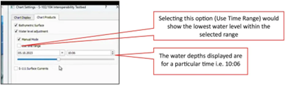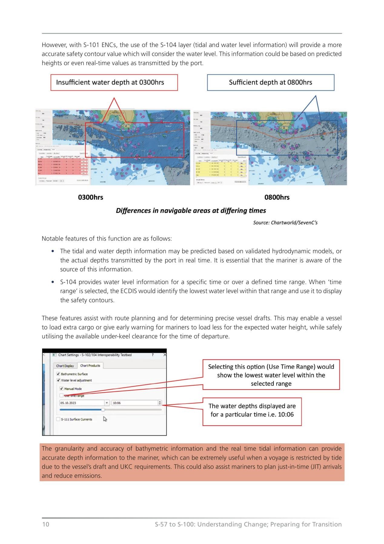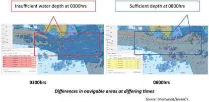 2)整合S-104(潮汐/水位数据),可基于预测值或港口实时传输数据,动态更新安全等深线(如某时段因低潮导致水深不足,ECDIS会自动调整警示范围)。