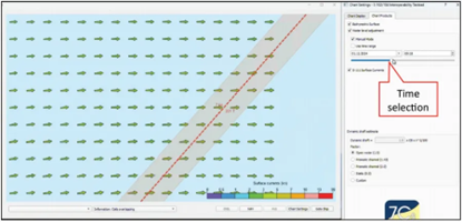 通过S-111图层,S-101ENC可显示特定时间的表层水流数据,辅助在沿海或受限区域(如河口、海峡)的航线规划和maneuvering决策。