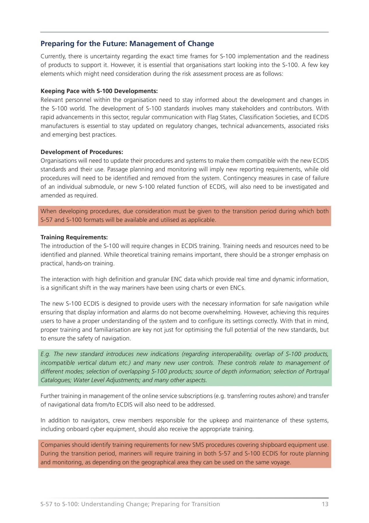 组织需与制造商和服务提供商合作以推动S-100过渡。这包括评估电子海图显示与ECDIS及其他船上系统对S-100要求的适用性,规划S-100数据供应系统和服务,并确定未来软件升级与硬件变更的机制。
