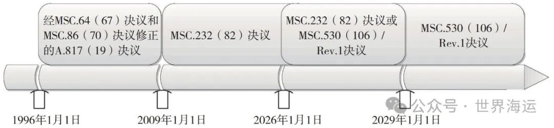 ECDIS性能标准先后诞生了三个版本,即A.817 (19 ) 决议 ( 含两次修订决议 )、MSC.232 ( 82 ) 决议、MSC.530 ( 106 ) 决议 ( 含一次修订决议 ),这三个版本分别适用于不同时间安装的ECDIS,而非简单地以新版本替代之前的旧版本,如图1所示,其中:
