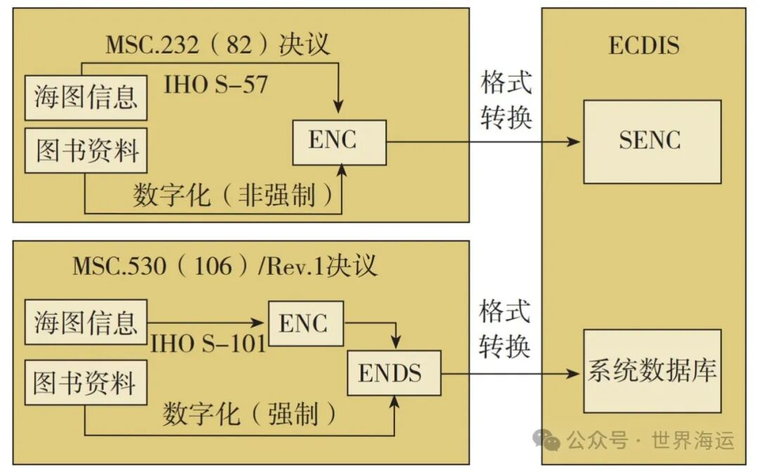 需要说明的是,MSC.530 ( 106 )/Rev.1决议定义的ENDS可包括按照IHO S-57制作的ENC数据,也可包括按照IHO S-101制作的ENC数据,同时应与其他S-100产品具有互操作性;MSC.232 ( 82 ) 决议定义的ENC是按照IHO S-57编制的。此外,根据第4.8条,MSC.530 ( 106 )/Rev.1决议要求ENDS必须按照IHO S-63 ( 适用于S-57 ENC ) 或者IHO S-100 ( 适用于S-101 ENC ) 加密,而MSC.232 ( 82 ) 可以使用加密或非加密的S-57 ENC。